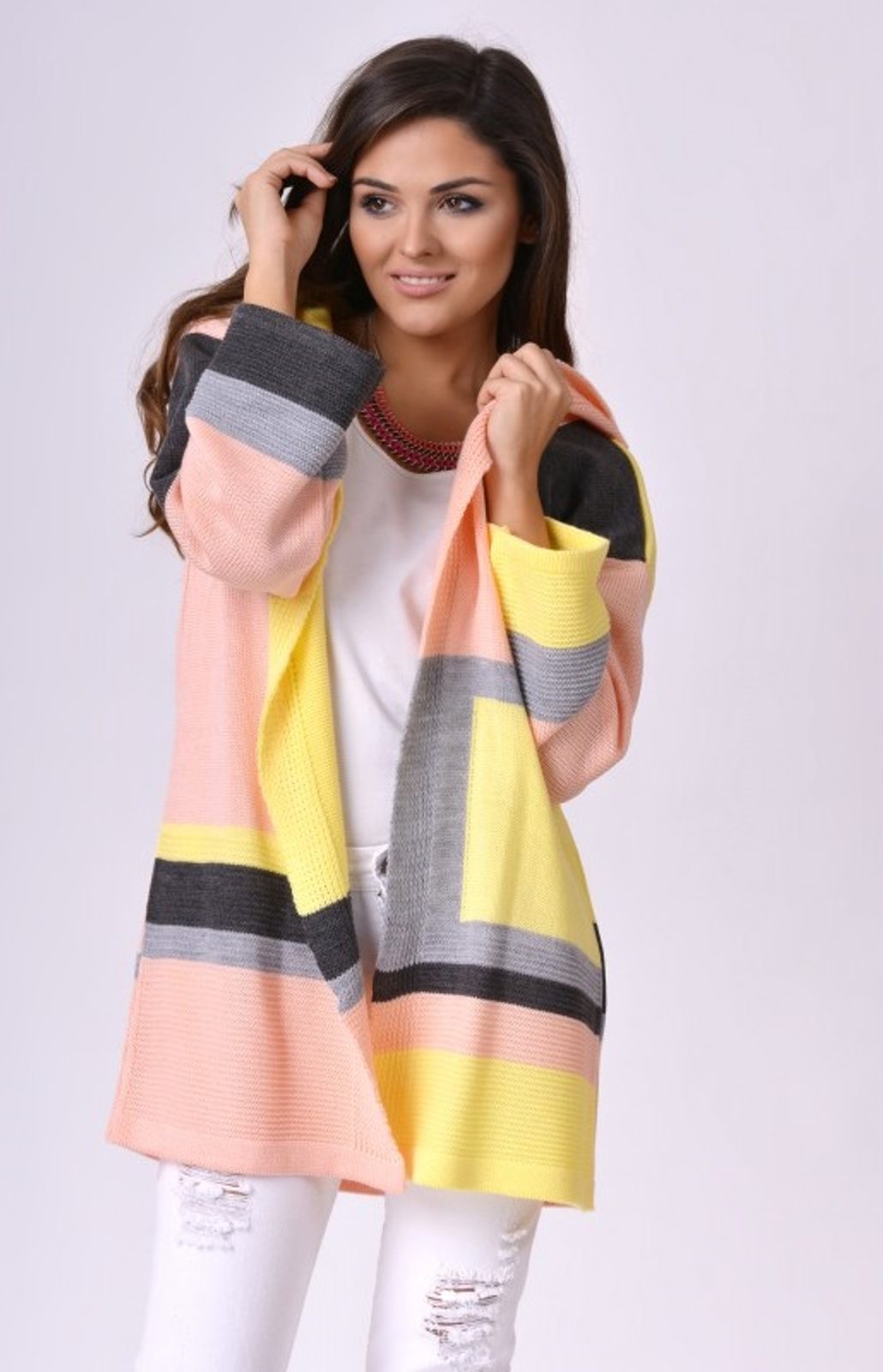 Příjemné pastelové barvy doplní každý jednoduchý outfit a vy budete mít díky kardiganu originální outfit během pár minut.