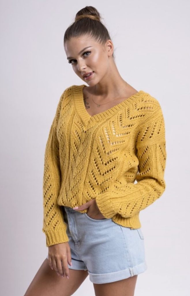 Navigace: DÁMSKÁ MÓDA » Svetry, mikiny » Dámský svetřík s háčkovaným vzorem - Mustard
