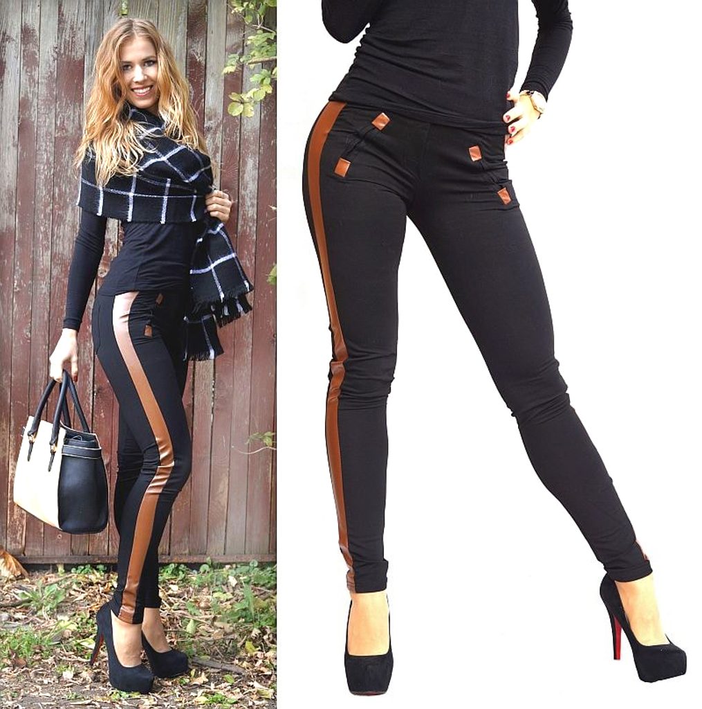 Tyto stylové černé legíny jsou doplněny hnědými prvky eko kůže, díky kterým jsou legíny velmi jedinečné.